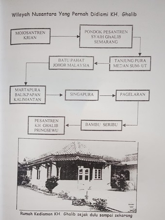 Sebelum beliau datang ke Lampung beliau telah menunaikan Ibadah Haji ke tanah suci Mekkah pada tahun 1927 dari Singapura. KH. Ghalib datang ke Lampung sekitar tahun 1927 dan berusia ± 28 tahun. Kedatangan beliau ke Lampung setelah mendapat cerita dari seorang sahabat bernama M. Anwar Sanprawiro pada saat berada di Singapura, tertarik dengan cerita tentang Lampung beliau kemudian bermusyawarah dengan isteri (Mbah Saiyah) dan bersama-sama Sanprawiro menuju Lampung. Sampai di Lampung beliau menumpang di rumah M. Anwar Sanprawiro di Pagelaran.